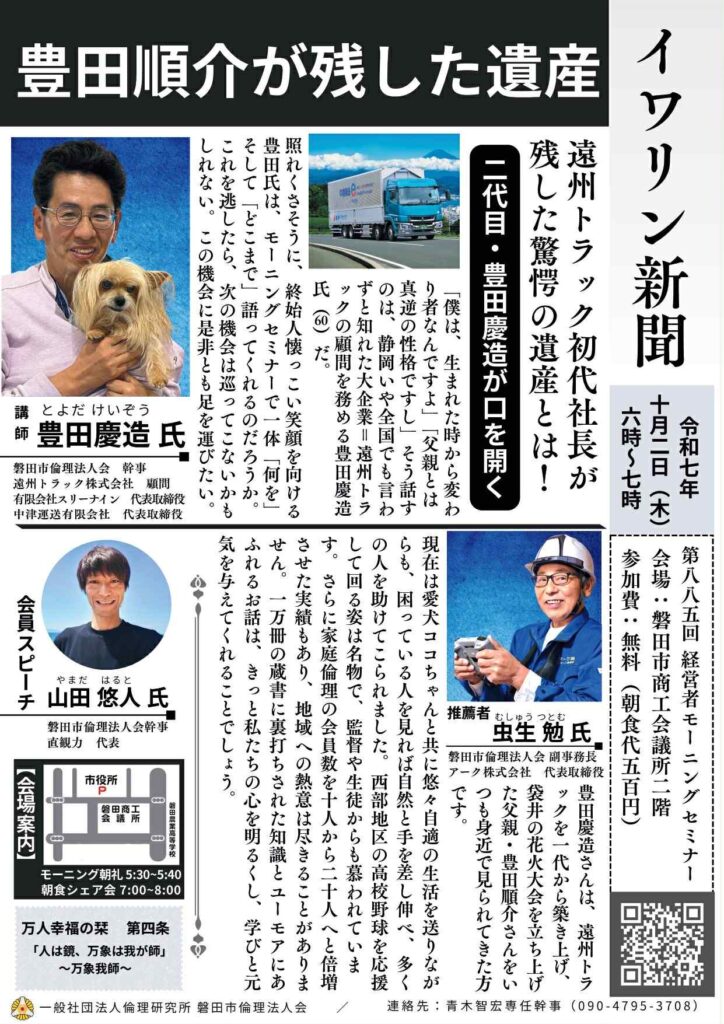 - 講師: 豊田 慶造 氏(磐田市倫理法人会 幹事、遠州トラック株式会社 顧問、有限会社スリーライン 代表取締役、中遠運送有限会社 代表取締役)