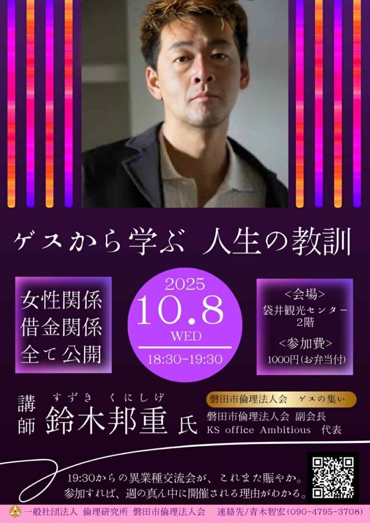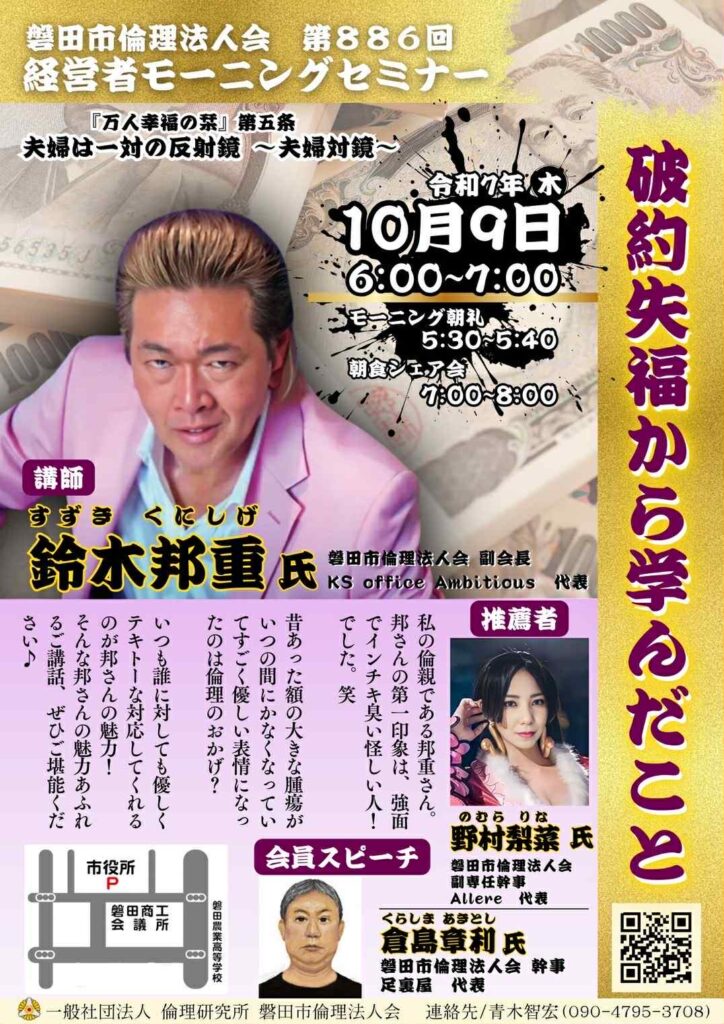 この度、磐田市倫理法人会では、鈴木邦重氏をお招きし、2日間にわたり特別セミナー・モーニングセミナーを開催いたします。