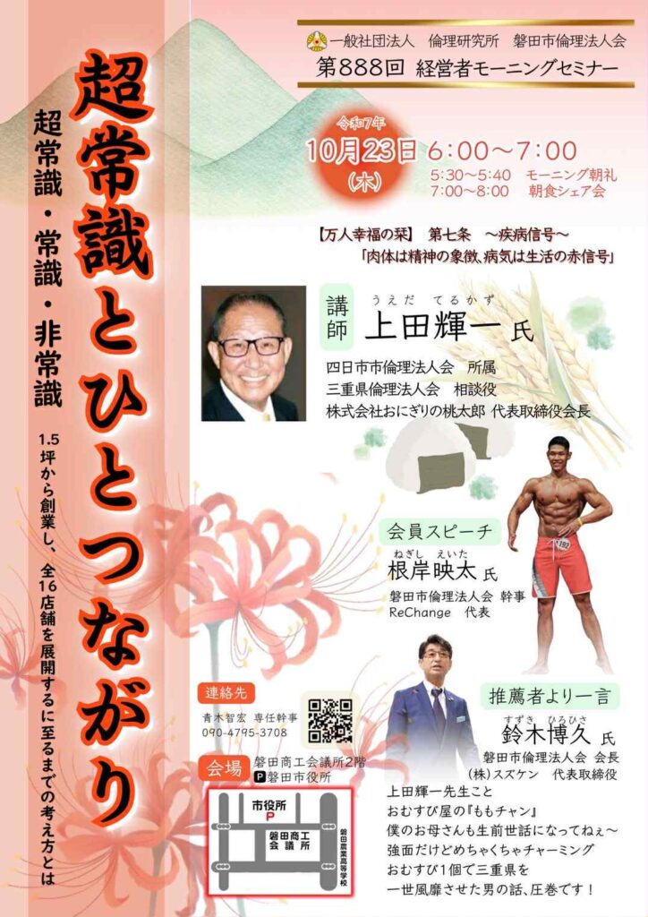 • 講師: 上田 輝一 氏(四日市市倫理法人会 所属、三重県倫理法人会 相談役、株式会社おにぎりの桃太郎 代表取締役会長)