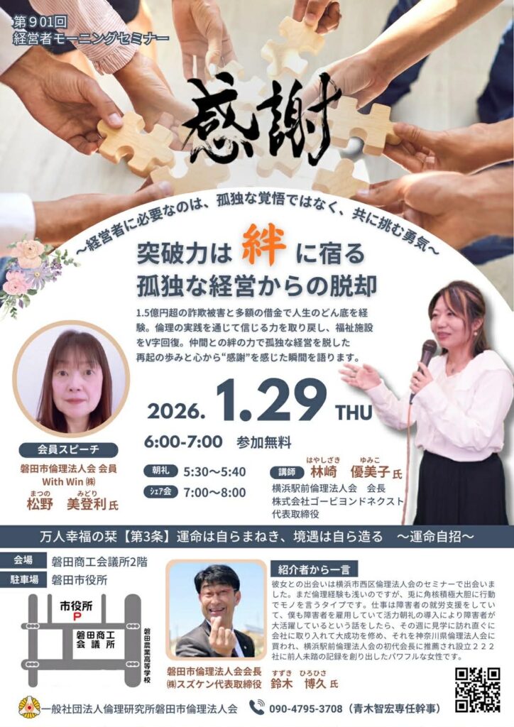 磐田市倫理法人会では、1月最終週に単会役員会と、横浜駅前倫理法人会 会長の林崎 優美子氏をお招きした経営者モーニングセミナーを開催いたします。
