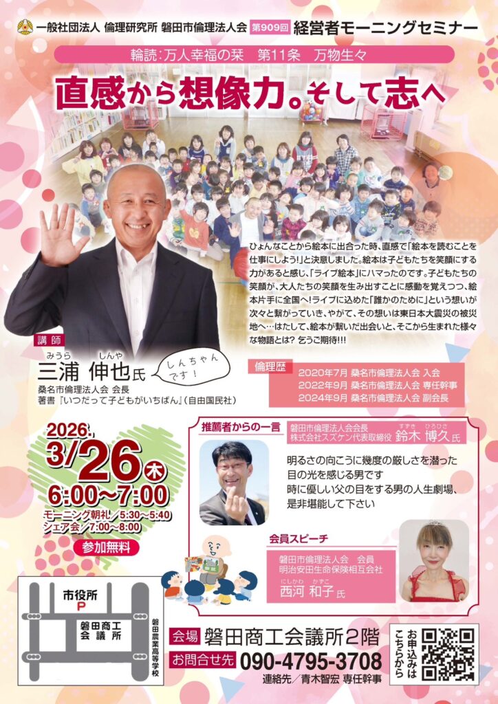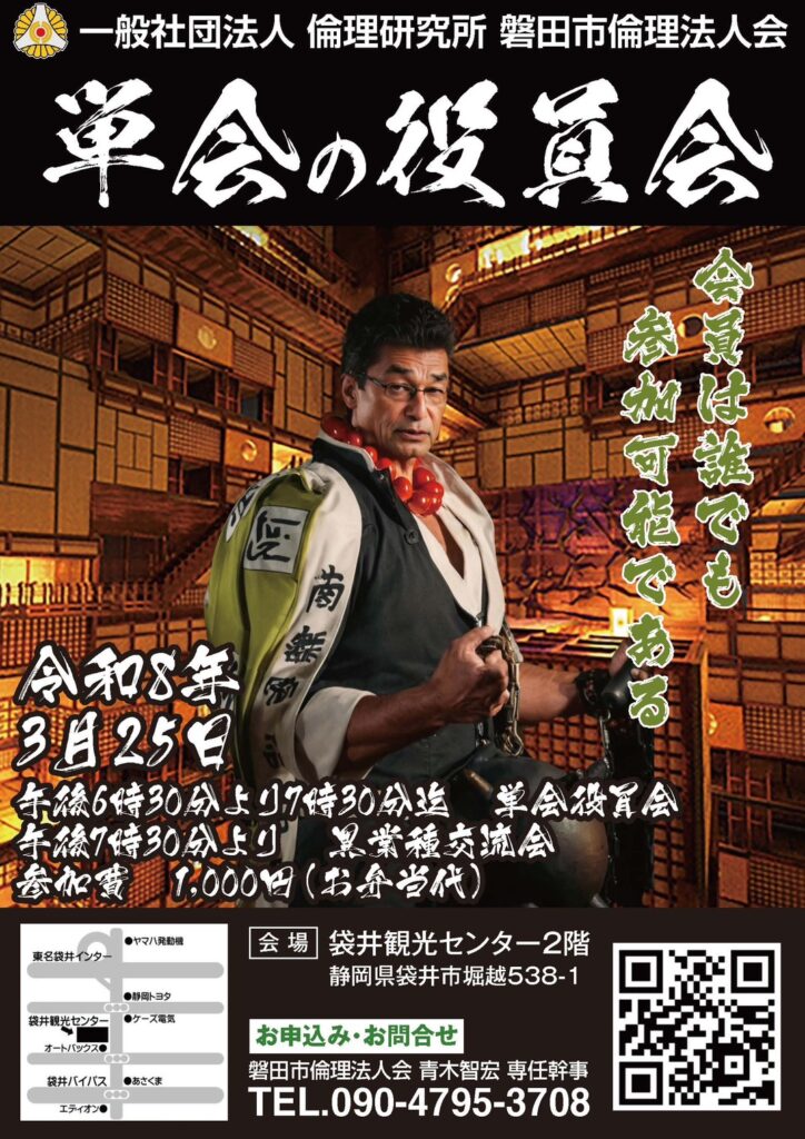 一般社団法人倫理研究所 磐田市倫理法人会 連絡先:青木智宏専任幹事 090-4795-3708 お申し込みはチラシのQRコードからどうぞ。